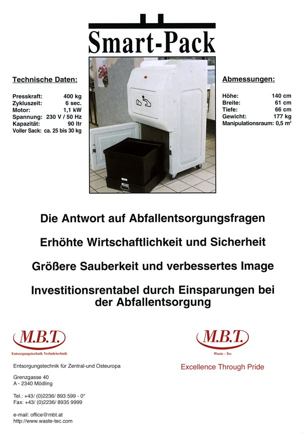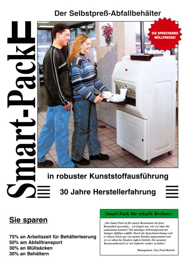 Wie der Name schon sagt, der ideale Müllschlucker für den In-Store - Bereich! Eingesetzt in Fastfood-Restaurants, Kinos, und allgemein im Take-Away-Bereich. Punkto Handling ist der Smartpack State of the Art !